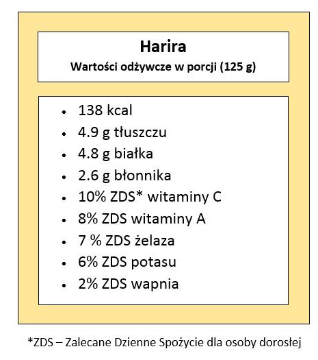 Harira to niezwykła marokańska zupa, którą je się przede wszystkim w trakcie Ramadanu. Oryginalne połączenie smaków i składników idzie w parze z sytością, co uzasadnia olbrzymią popularność potrawy, przede wszystkim jako kolacji. Harira może być przy tym bez przeszkód przygotowana w Polsce i będzie wówczas ciekawym urozmaiceniem jesiennego i zimowego menu, które aż prosi się o treściwe zupy.