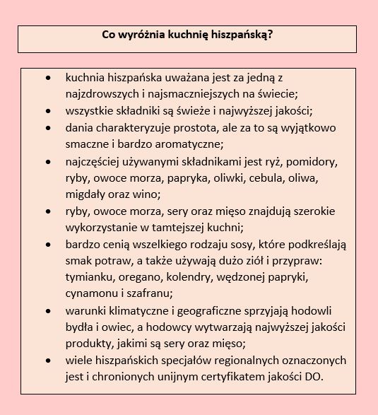 Kuchnia hiszpańska specjalizuje się w regionalnych przysmakach bazujących na produktach typowych dla kuchni śródziemnomorskiej. Dania charakteryzuje prostota, ale za to są wyjątkowo smaczne i bardzo aromatyczne. Najczęściej używanymi składnikami jest ryż, pomidory, ryby, owoce morza, papryka, oliwki, cebula, oliwa, migdały oraz wino. W Hiszpanii bardzo cenią wszelkiego rodzaju sosy, które podkreślają smak potraw, a także używają dużo ziół i przypraw: tymianku, oregano, kolendry, wędzonej papryki, cynamonu i szafranu.