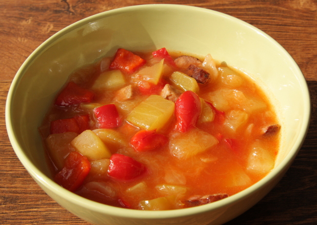 Zrób tak: w garnku przesmaż pokrojony w kostkę boczek aż wytopi się z niego tłuszcz. Dodaj pokrojoną w kostkę cebulę, a po kilku minutach paprykę pokrojoną w paski. Smaż jeszcze chwilę, dopraw łyżką słodkiej papryki w proszku i ostrą papryką do smaku, dokładnie wszystko pomieszaj, a gdy przyprawy połączą się z tłuszczem, dodaj pomidory i pastę paprykową. Dopraw solą i pieprzem. Gotuj aż papryka zmięknie, ale nie dopuść, by zaczęła się rozpadać.