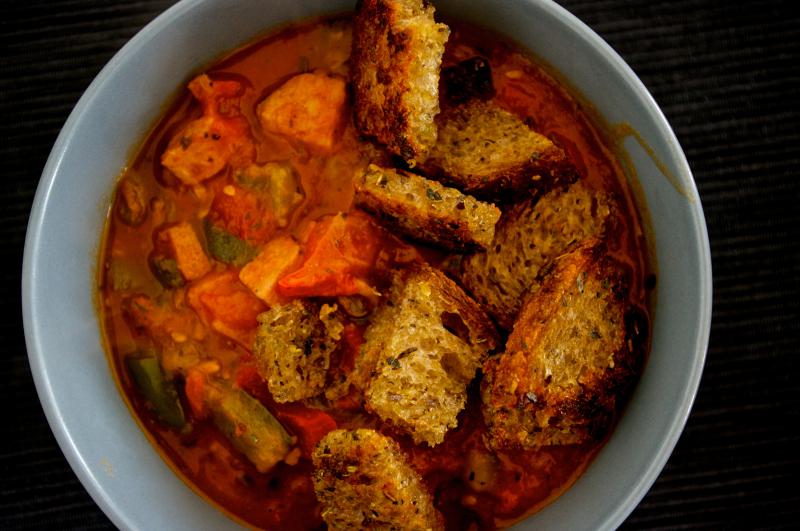 Na patelni rozgrzewamy oliwę z oliwek. Wrzucamy pokrojoną cebulę i czosnek, smażymy aż do zeszklenia. Następnie dorzucamy pokrojoną w kostkę cukinię i czerwoną paprykę. Dolewamy pół szklanki wody i dusimy warzywa, aż będą miękkie. Potem wrzucamy poszatkowane pomidory i koncentrat. Całość doprawiamy ulubionymi przyprawami, ziołami, solą kamienną, pieprzem zielonym i odrobiną chili. Przez kolejne 20 minut dusimy wszystkie składniki. Danie najlepiej serwować ze świeżą bagietką.