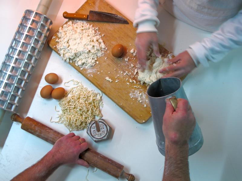 W zależności od osobistych preferencji i wyposażenia kuchni tak przygotowane ciasto można następnie przecisnąć przez specjalną maszynkę do wyrobu makaronu lub rozwałkować na pożądaną grubość i pokroić ostrym nożem na wstążki lub nitki. Gotowy makaron natychmiast gotujemy w osolonym wrzątku, ponieważ nadmierne wysuszenie sprawia, że kruszy się on po ugotowaniu.