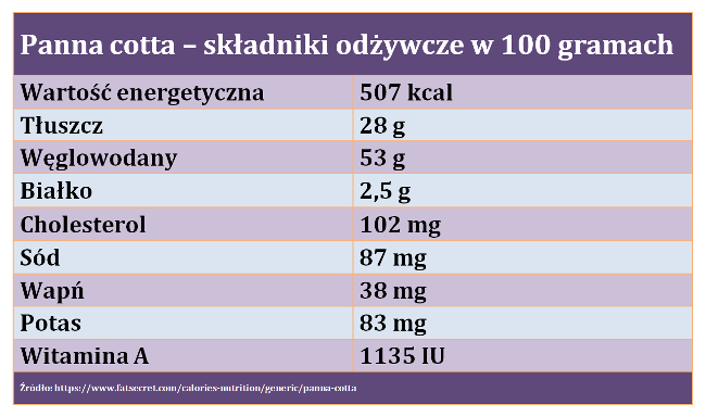 Tabelka prezentuje obecność poszczególnych składników w tradycyjnej panna cotcie.