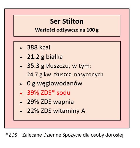 Ser Stilton zawiera minimum 48% tłuszczu pochodzącego oczywiście z mleka krowiego. Jest ogólnie zasobny w białko i lipidy, co może być zarówno wzbogaceniem ubogiej diety, jak i obciążeniem tej już obfitej. Zawiera dość sporu sodu, który nie jest korzystny dla układu krążenia, ale z drugiej strony obfituje w cenny dla kości wapń oraz ważną dla systemu immunologicznego i wzroku witaminę A. Na uwagę zasługuje również obecność dużej ilości witaminy K2 w serze Stiltonie, wyższej niż np. w mozzarelli, camembercie czy serze Gruyere. (Vermeer, 2018).