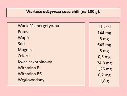 Ocet winny, jako kolejny składnik sosu chili, dzięki niskiej kaloryczności i braku tłuszczu świetnie sprawdzi się w diecie osób odchudzających się, ponieważ przyspiesza metabolizm i hamuje apetyt. Co więcej, ocet winny wspomaga proces trawienia i pobudza wydzielanie sków trawiennych, a także może obniżyć ciśnienie krwi. Kolejny składnik sosu chili, korzeń imbiru posiada wiele cennych substancji wykazujące działanie lecznicze. Wszelkiego rodzaju napary, syropy czy sosy przygotowane na jego bazie, wykazują właściwości przeciwzapalne, przeciwwirusowe, wykrztuśne i przeciwbakteryjne. Znakomicie sprawdzi się także jako środek wspomagający leczenie przeziębienia. Zmniejsza też lepkość krwi, chroniąc tym samym przed tworzeniem się zatorów i zakrzepów, obniża ciśnienie i stężenie cholesterolu LDL we krwi, wpływa korzystnie na pracę serca, poprawia koncentrację i dodaje energii oraz witalności.
