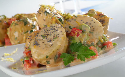 6. Na wierzchu udekoruj ją ziarnami maku, startą skórką limonki oraz listkami natki pietruszki.