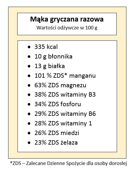 Tradycyjna Medycyna Chińska już od długich setek lat wykorzystuje grykę jako lekarstwo na biegunki, nadciśnienie, dyzenterię oraz nadmierne pocenie. Współczesna nauka przede wszystkim podkreśla dobrodziejstwo w postaci bogactwa mineralnego, które całe trafia do mąki gryczanej – mowa o szczególnie wysokich proporcjach cynku, fosforu, manganu, magnezu, miedzi, żelaza a także bardzo ciekawym zestawie aminokwasów. Mąka gryczana zawiera bowiem stosunkowo dużo białka, na które składają się m.in. leucyna, izoleucyna oraz rzadko obecna w zbożach lizyna. Z punktu widzenia wartości odżywczych na uwagę zasługuje również wysoki poziom witamin z grupy B oraz rutyny – cennego antyoksydantu wzmacniającego naczynia krwionośne.