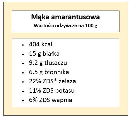 Sama mąką z amarantusa ma lekko żółtawą, a nawet beżową barwę i jest wyraźnie cięższa w konsystencji niż mąka pszeniczna. Pod względem fizyczno-chemicznym odznacza się niższym poziomem wilgotności i lepkości, ale za to wyższą zawartością popiołu, tłuszczu, białka i błonnika. Nie będzie więc dla nikogo niespodzianką, że trudniej jest uformować z niej gładkie ciasto.