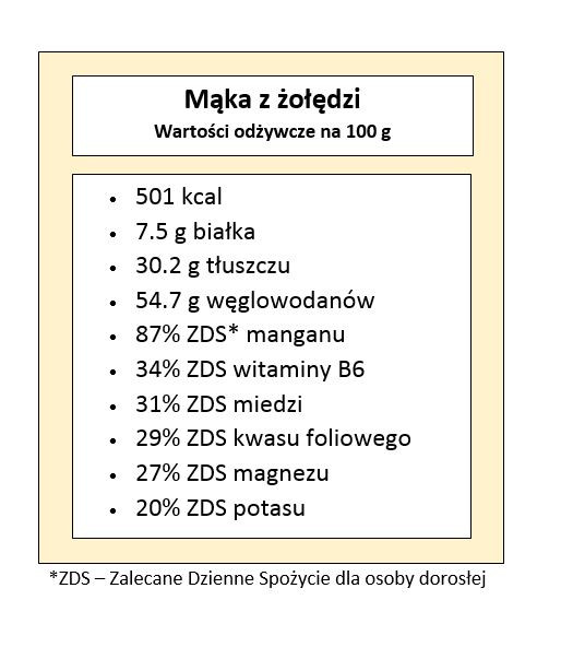 Mąka z żołędzi była jednym z podstawowych elementów diety Indian Północnoamerykańskich, którzy nie znali jeszcze pszenicy. Dziś jako klasyczna zdrowa żywność cieszy się coraz większym zainteresowaniem wśród ludzi próbujących walczyć z dominacją wysoce przetworzonych, małowartościowych pokarmów. Bezglutenowa i wysokotłuszczowa, mąka z żołędzi jest bardzo cennym dodatkiem do podręcznej spiżarni!