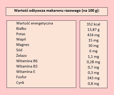 Dzięki temu, że powstaje z mąki z pełnego ziarna, makaron razowy bogaty jest w wiele cennych substancji odżywczych. Jego głównym składnikiem jest istotny dla naszego zdrowia błonnik. Odpowiada za regulację pracy jelit oraz dba o odpowiedni metabolizm naszego organizmu. Dzięki błonnikowi nasze jelita będą czystsze, a wypróżnianie stanie się łatwiejsze. Co więcej, błonnik zmniejsza wchłanianie cholesterolu, a tym samych chroni przed chorobami układu krwionośnego. Spożywanie produktów z dużą zawartością błonnika (w tym również makaronu razowego) sprawia, że dłużej odczuwamy sytość. Jest to ważne dla osób dbających o linię, ponieważ przez dłuższy czas nie odczuwa się potrzeby sięgnięcia po kolejny posiłek.