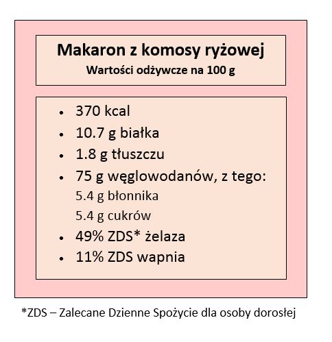 Komosa ryżowa jako taka jest pokarmem bardzo wartościowym i doskonale pasującym do diety bezglutenowej. Drobne nasionka nie są jednak szeroko akceptowalnym produktem – po pierwsze bowiem, zawierają saponiny, które trzeba wypłukać pod gorącą wodą, aby posiłek nie był gorzki; po drugie zaś, nie każdy docenia konsystencję komosy ryżowej i wymagające długiego gotowania przepisy na jej bazie. Makaron z komosy ryżowej jest tymczasem nie tylko łatwy w przygotowaniu, ale pozwala przyrządzać znane i lubiane dania międzynarodowej kuchni bez zawartości glutenu!