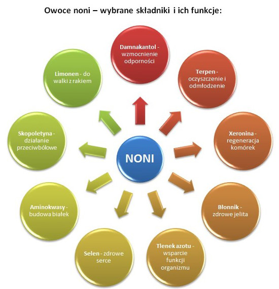 Jadalne owoce noni kryją w sobie mnóstwo cennych dla zdrowia aktywnych substancji. W 100 g korzenia, kwiatów, owoców lub soku znajduje się po 3-4 g glukozy i fruktozy, soli mineralnychmagnezu, potasu, selen, sodu i wapnia oraz 0,2-0,5 % białka w soku i 2,5 % w całym owocu oraz 0,1-0,2 % tłuszczu, aminokwasy i węglowodany. Sok z noni stanowi dodatkowo cenne źródło witamin –  witamin A, witaminy z grupy B , witamin C i E. Owoce tej rośliny są także pełne kwasu askorbinowego. 100 gramowa porcja koncentratu to aż 251 % dziennego zapotrzebowania na tę witaminę! Co więcej, noni dostarcza nam licznych związków polifenolowych i irydoidowych. Znajdziemy w niej skopoletynę, rutynę, kwercetynę, kwas asperulozydowy i deacetyloasperulozydowy. Owoce tej rośliny kryją w sobie również antrachinony, ligniny i błonnik. Jednym słowem, skład chemiczny Morinda citrifolia sugeruje, że mamy do czynienia z prawdziwym panaceum!