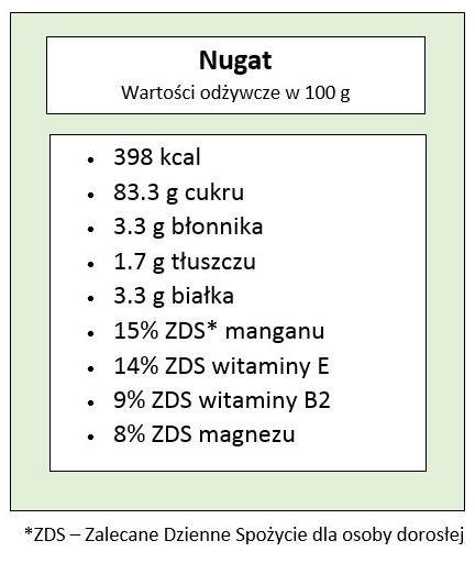 Oczywiście bagaż cukrowy jest bezwzględnie ciężki – 100 g nugatu ma średnie obciążenie glikemiczne na poziomie 66. Ubogi w tłuszcze i białka, przysmak składa się głównie z cukrów, które oprócz fatalnego wpływu na metabolizm i wagę ciała, zagrażają również zębom – zwłaszcza w owej klejącej się konsystencji. Na korzyść nugatu przemawia za to zawartość orzechów, pokarmu uznawanego powszechnie za bardzo odżywczy. To dzięki nim słodka przekąska dostarcza organizmowi witamin – witaminy E oraz B2, jak również minerałów: fosforu, manganu, miedzi i żelaza. Dla poprawności naukowej trzeba jednak dodać, że zdecydowanie zdrowiej jest jeść same orzechy, a ich zawartość w nugacie nie jest znowu aż tak wysoka!