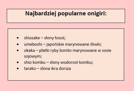 Onigiri to nic innego jak ryżowa kulka z nadzieniem w środku. W Kraju Kwitnącej Wiśni w gotowany ryż zawija się prawie wszystko: różne gatunki ryb, glony, marynowane warzywa, grillowane mięso, kawior czy smażone w głębokim tłuszczu krewetki. Onigiri stanowi dla Japończyków smaczną i zdrową przekąskę, którą zabierają dosłownie wszędzie: do szkoły, pracy, na piknik i w podróż.