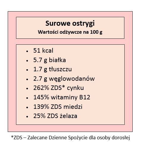 I tak konsumpcja ostryg dostarcza organizmowi przede wszystkim niezwykle wysokich dawek kluczowej dla zdrowia witaminy B12, która jest najczęściej deficytową wśród całej grupy B. Ponadto ostrygi są bardzo bogatym źródłem cynku, miedzi i żelaza, a więc pierwiastków warunkujących szereg kluczowych procesów życiowych. Obecność cynku właśnie wiąże się z legendarną renomą ostryg jako afrodyzjaku – faktycznie ów minerał odgrywa bowiem zasadniczą rolę w męskiej płodności i produkcji testosteronu.