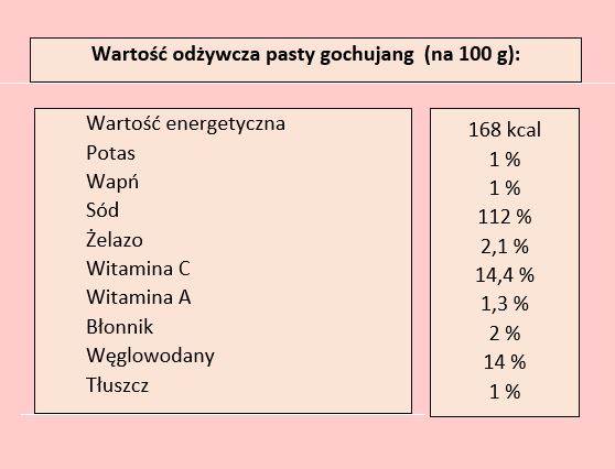 Pasta gochujang nie jest bogatym źródłem witamin i minerałów, ale zawiera składniki odżywcze, które są korzystne dla ludzkiego organizmu. Są to między innymi: białko, witamina B2 (odgrywa ważną rolę w procesach przemiany materii i jest niezbędna do tworzenia czerwonych płytek krwi, produkcji antyciał przez układ odpornościowy i procesu wzrostu), witamina C (niweluje oznaki zmęczenia, walczy z problemami dziąseł i nieprzyjemnym oddechem, łagodzi podatność na infekcje, jest także silnym antyoksydantem, który chroni przed działaniem wolnych rodników), żelazo (wytwarza hemoglobinę, zapobiega powstawaniu anemii i korzystnie wpływa na odporność organizmu), potas (to bardzo ważny pierwiastek, który zapewnia prawidłową gospodarkę wodno-elektrolitową i kwasowo-zasadową organizmu), wapń (stanowi podstawę tkanki łącznej, kości i zębówkrzepnięciu krwi, regulacji niektórych hormonów), beta-karoteny (zapewnia prawidłowe funkcjonowanie wzroku, wzmacnia odporność oraz opóźnia powstawanie zmarszczek) oraz kapsaicyna.