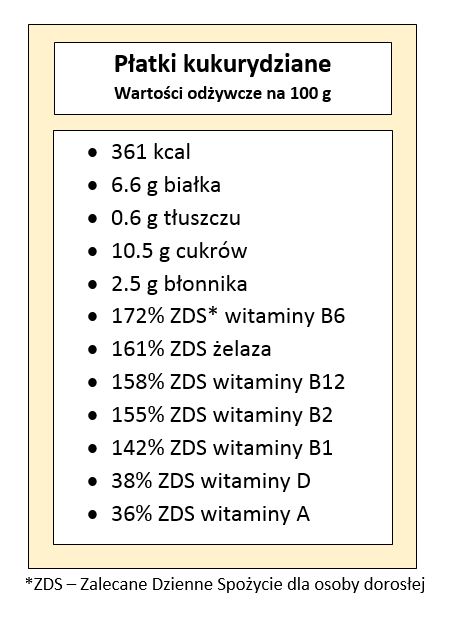 Płatki kukurydziane prezentują się jako bardzo kuszący wybór śniadaniowy – niezwykle łatwy i szybki w przygotowaniu, lekki, a jednocześnie przyjemnie zaspokajający głód i naturalną dla człowieka potrzebę chrupania. Jedzone z zimnym mlekiem lub jogurtem pomagają przemycić do codziennej strawy białko i wapń, a dzięki wspomnianej wyżej fortyfikacji dostarczają organizmowi także pokaźnych ilości witamin B1, B2, B3, B6, B12, często także kwasu foliowego oraz witamin A, D lub E. Bardzo korzystny jest również dodatek żelaza – pierwiastka, które niedobory są dość częste i groźne, zwłaszcza dla niejadków.