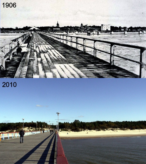 W następnych latach hr. Józef Tyszkiewicz kazał zbudować przystań (w l. 1884 – 1889) i drewniany pomost spacerowy, który miał ponad kilometr długości. Cumował przy nim kupiony przez Tyszkiewicza niewielki pasażersko-towarowy parostatek „Phoenix”. Chodziło o ułatwienie komunikacji morskiej z Libawą. Molo – od 1892 r. ulubione miejsce spacerów letników – niezbyt długo stanowiło atrakcję miejscowości, gdyż wkrótce zasypał je nanoszony przez morskie fale piasek. Powstały również drewniane domki dla „kąpielników” oraz Kurhauz. W początkowym okresie bywało tu 500 – 600 gości w sezonie letnim.