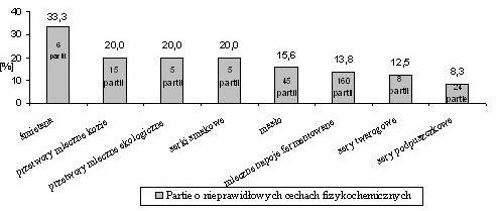 Jeżeli chodzi o nieprawidłowości w zakresie parametrów fizykochemicznych, to stwierdzono je w przypadku 14,2% skontrolowanych partii przetworów mlecznych. Zakwestionowano m. in. niejednolitą barwę lub niezgodną z deklaracją zawartość tłuszczu, wody lub białka.