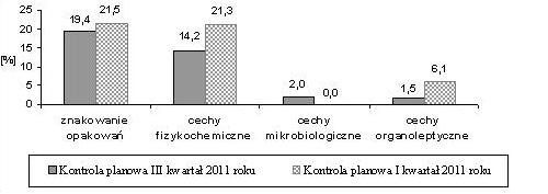 W wyniku przeprowadzonej, w III kwartale 2011 roku, kontroli jakości handlowej przetworów mlecznych najwięcej nieprawidłowości stwierdzono w zakresie znakowania – 19,4 procent skontrolowanych partii przetworów mlecznych. Mniejszy udział nieprawidłowości odnotowano w zakresie cech fizykochemicznych, mikrobiologicznych i organoleptycznych. Wynosił on odpowiednio: 14,2 proc.; 2,0 proc., oraz 1,5 proc. partii objętych kontrolą.