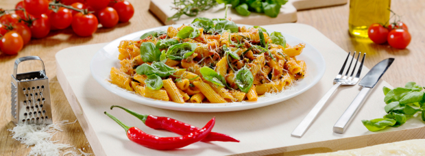 Penne to jeden z najbardziej znanych rodzajów makaronu. Pochodzi z Kampanii w południowej części Italii, ale bez problemu można go kupić w sklepach na całym świecie. Ma kształt skośnej rurki i jest znakomitą bazą wielu domowych potraw. My proponujemy szybki przepis na Penne Volcano – gotujemy makaron, robimy sos i … voila danie gotowe!