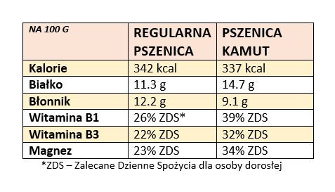 Pszenica kamut z kolei stawiana jest w opozycji do współczesnych, zasadniczo zmodyfikowanych gatunków, jako źródło wartości odżywczych znacznie przyjaźniejszych dla ludzkiego organizmu. Przede wszystkim jej duże ziarna zawierają nawet o 20-40% więcej białka niż regularna pszenica, co w kategoriach dietetycznych jest niewątpliwą zaletą. Co więcej, wszystkie starożytne zboża konsumowane są zazwyczaj w postaci pełnoziarnistej, co dodatkowo zwiększa ich zawartość mineralną. Pszenica kamut jest przy tym niezwykle bogaty w selen, magnez i witaminy z grupy B.