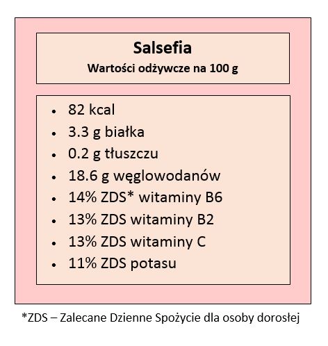 Salsefia jest warzywem umiarkowanie kalorycznym, które nie obciąży na pewno dziennego bilansu energetycznego, ale może skutecznie zaspokoić głód i zapewnić sytość na dłużej. Nie zawiera przy tym cukrów prostych, ale jest za to dobrym źródłem błonnika spożywczego. W korzeniu znajdują się również śladowe ilości białka oraz witaminy – przede wszystkim z grupy B, ale także witamina C, a ponadto nieco potasu, manganu, magnezu oraz fosforu. Zawartość tłuszczów w salsefii jest przy tym bliska zeru.
