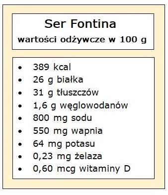 Tabelka przedstawiająca składniki odżywcze sera Fontina w 100 g produktu; opracowanie własne na podst. https://www.nutritionvalue.org