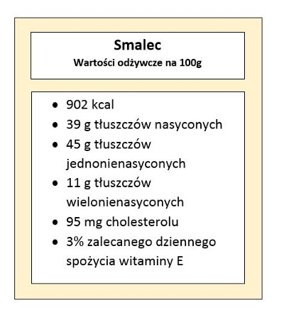 Smalec jest w 100% tłuszczem, co oznacza, że nie zawiera żadnych białek, ani węglowodanów. Trudno się więc dziwić, że jest kaloryczny i dla utrzymania szczupłej sylwetki powinien być konsumowany w racjonalnych ilościach. Na uwagę zasługuje jednak struktura jego kwasów tłuszczowych, odkrycie której przywróciło wieprzowy tłuszcz do łask. Rozpętana przez producentów olejów roślinnych i margaryn kampania przeciw tłuszczom pochodzenia zwierzęcego nie uwzględniła bowiem, że obok kwasów tłuszczowych nasyconych, których w smalcu jest ok. 40%, zawiera on także znaczące ilości zdrowych łańcuchów tłuszczy.