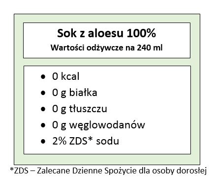Istnieje dość duża różnica między żelem z aloesu, który jest de facto czystym miąższem kolczastych liści, a sokiem z aloesu, będącym silnie rozrzedzoną wersją tego pierwszego. W rezultacie szklanka soku 100% nie zawiera praktycznie żadnych kalorii, węglowodanów, białka, tłuszczu, a ilości witamin i minerałów są śladowe.