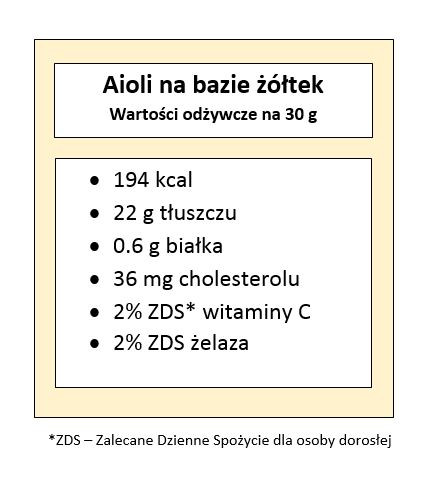 Oliwa z oliwek to co prawda wysokokaloryczny produkt, złożony w 100% z tłuszczów, ale są to w ponad 70% jednonienasycone kwasy tłuszczowe słynące ze swojej dobroczynności dla zdrowia. Jednym z nich jest kwas oleinowy będący niezwykle silnym antyoksydantem, chroniącym przede wszystkim serce i układ krążenia. Oliwa z oliwek regularnie pojawiająca się w diecie okazuje się zasadniczo obniżać poziom złego cholesterolu LDL, podwyższając przy tym poziom dobrej frakcji HDL. Ponadto naukowcy sugerują, że wykazuje ona ogólne działanie przeciwzapalne, chroniąc nie tylko przed chorobami autoimmunologicznymi, ale także rozwojem procesów nowotworowych. Sos Aioli jako dobre źródło oliwy z oliwek ma również wpływać korzystnie na mózg – poprawiając pamięć i koncentrację, a z drugiej strony obniżając skłonności do depresji, huśtawek nastroju i zaburzeń snu.
