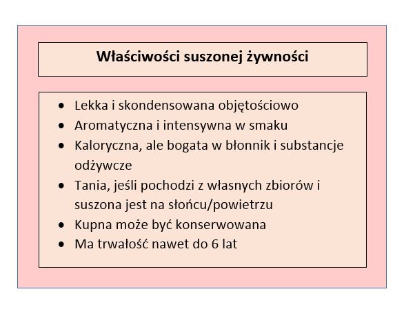 Suszone produkty charakteryzuje przede wszystkim intensywny smak, często atrakcyjniejszy i bardziej pożądany w kuchni niż smak świeżych warzyw czy owoców. Doskonałym przykładem są tutaj suszone grzyby niezastąpione w polskich potrawach bożonarodzeniowych. Poza tym suszonki są atrakcyjnie lekkie i skondensowane pod względem objętości, łatwe do samodzielnego przygotowania w warunkach domowych, poręczne oraz łatwe w wykorzystaniu – można je konsumować samodzielnie lub namaczać w wodzie dla uzyskania miększej konsystencji. Suszenie na powietrzu czy na słońcu jest również całkowicie ekologiczne, gdyż nie wiąże się z wydatkami energii elektrycznej.