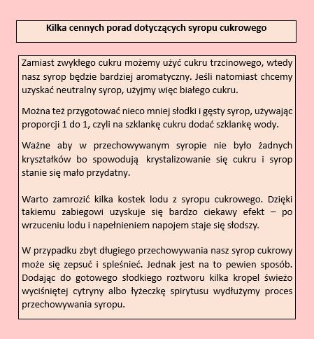 Jeśli planujemy organizację przyjęcia z kolorowymi drinkami w roli głównej, syrop cukrowy będzie wtedy niezastąpiony. Doskonale sprawdzi się zarówno jako element naszych koktajli, ale także z jego udziałem możemy upiec ciasta, które idealnie będą się komponowały z trunkami. Poza tym, syrop cukrowy to po prostu rozpuszczony cukier, który dostarcza nam tylko bezwartościowych węglowodanów, niezależnie od jego gatunku. Z kolei jedzenie pustych kalorii sprawi, że w ekspresowym tempie zyskamy dodatkowe kilogramy. Dlatego też nie warto go często stosować, lepiej zachować go na specjalne okazje.