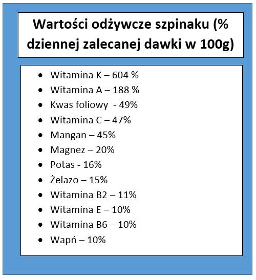 Na uwagę zasługuje jednak przede wszystkim bogactwo witaminy A i K. Wystarczy zjeść 100-gramową porcję szpinaku, aby zapewnić sobie ponad 6-krotną zalecaną dzienną dawkę witaminy K i 188% zalecanej dawki witaminy A. Jakby tego było mało, szpinak zawiera również pokaźne ilości innych witamin m. in.: witaminy z grupy B (witamina B1, B2, B3, B4, B5, B6, i B9), witaminy C i E.