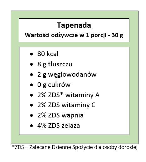 Poza tym w tapenadzie nie brakuje witamin: witamina A, C, E, K oraz witaminy z grupy B, a także minerałów, przede wszystkim: magnezu, wapnia i żelaza. Wariant z dodatkiem anchois bogaty jest również w jod.