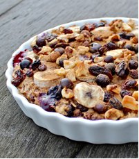 Piekarnik rozgrzać do 190⁰C. Płatki owsiane umieścić w misce, zalać wrzącą wodą, pozostawić na 10 minut. W tym czasie pokroić banana w plasterki i rozdrobnić orzechy na małe kawałki. Gdy płatki wchłoną wodę, dodać do nich banany, owoce jagodowe, rodzynki, mleko migdałowe, orzechy, cynamon i syrop z agawy, wymieszać. Przełożyć wszystkie składniki do naczynia do pieczenia, posypać cynamonem. Piec przez 20 minut, aż wierzch się lekko zarumieni.