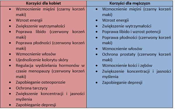 O niesamowitości macy decyduje fakt, że jest ona rośliną o właściwościach adaptogennych, co oznacza, że jej działanie dopasowuje się do indywidualnych potrzeb każdego organizmu. Regularne spożywanie skarbu Inków skutecznie wspomaga leczenie schorzeń wynikających z osłabienia jednego z organów (np. wzroku). Jako że działanie macy dostosowuje się do płci osoby, która ją spożywa, można sporządzić zestawienie korzyści, jakie peruwiańska roślina przynosi zarówno kobietom, jak i mężczyznom.