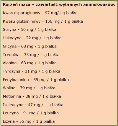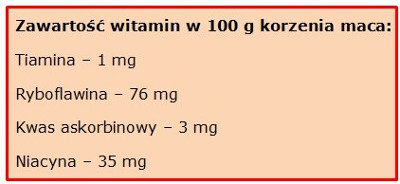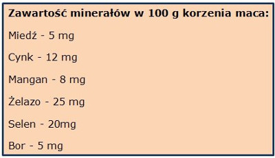 Wyróżniają się też zawartością wielu soli mineralnych – bor, cynk, jod, mangan, miedź, potas, selen, sód, wapń i żelazo. Żelaza i wapnia jest w nich więcej niż w bulwach ziemniaczanych. W warunkach laboratoryjnych można z tej rośliny wyizolować mnóstwo tajemniczo brzmiących substancji, które stanowią o cudownych właściwościach tego indiańskiego zioła. Mowa tu o glukozynolatach, olejkach gorczycznych, leukoantocyjanianach, garbnikach, saponinach, taninach, terpenoidach oraz steroidach. Złoto Inków, podobnie jak żeń-szeń, uznaje się za adaptogen, czyli żywność, która kryje w sobie substancje wzmacniające odporność organizmu na stresy i stany lęku. Z tego względu specjaliści medycyny naturalnej zalecają spożywanie tej rośliny nie tylko dla zwiększenia fizycznej witalności. Udowodniono, że regularne stosowanie tego suplementu powoduje zarówno zwiększenie energii, jak i psychicznej wytrzymałości. Preparaty z macy są ponadto stosowane jako środki wspomagające gojenie się ran, w przypadkach niedokrwistości, w zaburzeniach miesiączkowania, obniżonej odporności, objawach menopauzalnych, problemach z płodnością, bezsenności czy osteoporozie.