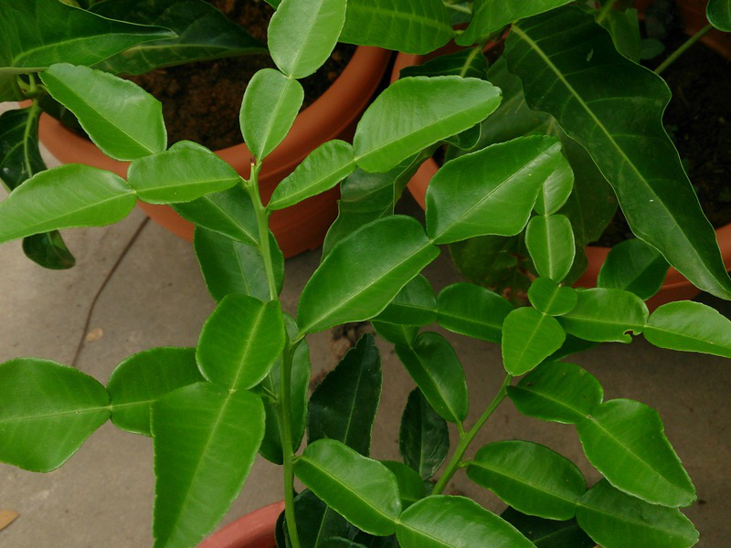 Charakterystyczne, podwójne liście kaffiru – uprawa doniczkowa; źródło: Wikimedia Commons
