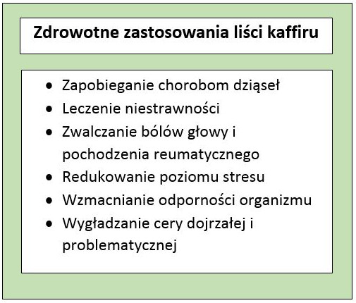 Nietrudno się domyślić, że taki imponujący bukiet zapachowy może nie tylko poprawiać smak jedzenia, ale także wpływać na zdrowie. Liście kaffiru faktycznie od wieków cieszą się popularnością jako surowiec leczniczy w wielu krajach Azji. Oprócz wspomnianych już wyżej związków eterycznych, zwierają one również cenne alkaloidy, dając skumulowane działanie przeciwbakteryjne, przeciwzapalne i pobudzające.