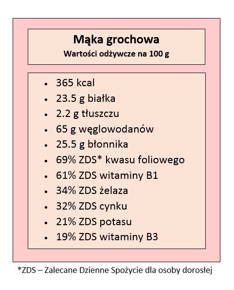 Wreszcie, jako produkt bezglutenowy, mąka grochowa jest niezwykle bogata w witaminy z grupy B, zwłaszcza kwas foliowy zapobiegający wadom cewy nerwowej u płodów, a także żelazo, cynk i potas. Z tego punktu widzenia jest szczególnie polecana kobietom w ciąży, osobom na diecie oraz wegetarianom i weganom. Dodajmy, że łatwiej jest skorzystać z wspomnianych wyżej korzyści konsumując mąkę grochową niż sam groch, którego dla tego samego efektu trzeba być zjeść ogromne ilości!