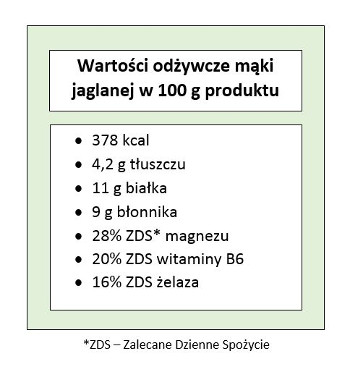 Mąka jaglana nie różni się wiele w składzie odżywczym od kaszy jaglanej – jest to po prostu produkt o drobniejszej konsystencji wynikającej z głębszego przemiału. Jest przy tym dość kaloryczna i bogata w węglowodany, ale poważną ich część stanowi korzystny dla zdrowia błonnik. Na uwagę zasługuje jednak przede wszystkim wysoki poziom witamin i soli mineralnych. Proso jest kopalnią witamin z grupy B, zwłaszcza witamina B1, B2, B3 i B6, a w mniejszej proporcji również kwasu foliowego. Ponadto zawiera imponujące dawki fosforu, magnezu, manganu, miedzi, selenu i żelaza. Naukowcy podkreślają również ciekawy skład białek – w mące jaglanej znajdują się cenne aminokwasy, takie jak wspomagający układ nerwowy tryptofan, budująca mięśnie leucyna czy gwarantująca poprawny metabolizm izoleucyna.