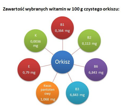 Orkisz stanowi dużo zdrowszą alternatywę dla popularnej pszenicy chlebowej. Dostarcza więcej białka (13-17 %) niż jej ziarno, zaś zawarty w nim gluten znacznie rzadziej uczula, a nawet jest tolerowany przez niektórych chorych na celiakię. Co więcej, orkisz zawiera tłuszcze, białko, węglowodany, błonnik, cukry, skrobie, sterole, sole mineralne – cynk, fosfor, magnez, mangan, miedź, potas, selen, sód, wapń i żelazo oraz witamin – witamina A, witaminy z grupy B (witamina B1, B2, B3, B5, B6 i B9), witamina E i K.