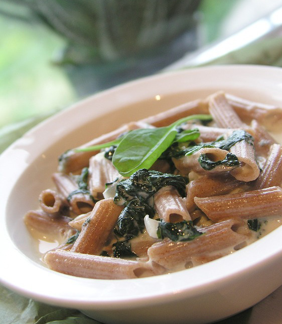 W osolonym wrzątku gotujemy makaron penne al dente, a następnie odcedzamy. Liście szpinaku dokładnie opłukujemy, odcinamy ogonki, parzymy wrzątkiem i starannie cedzimy. Na patelni rozgrzewamy oliwę z oliwek, mieszając podsmażamy na niej szpinak. Dodajemy drobno posiekany czosnek i pokrojone w paski suszone pomidory. Całość dusimy przez chwilę. Następnie dodajemy śmietankę, wkruszamy ser pleśniowy i całość mieszamy, potem przez 2-3 minuty dusimy pod przykryciem na małym ogniu. Do smaku doprawiamy solą i pieprzem. Do sosu dodajemy makaron, całość dokładnie mieszamy i chwilę podgrzewamy.