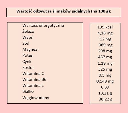 Pomimo negatywnej otoczki, ślimaki jadalne są daniem zdrowym i bardzo energetyzującym. W 100 gramach mięsa znajduje się 25 gr białka i jedynie 2 gr tłuszczu, ale tylko 0,07 gr cholesterolu. Ślimaki zawierają także wiele cennych minerałów, takich jak fosfor, magnez, żelazo, wapń, selen, cynk, witamina E, witamina B6 oraz witaminę C. Dodatkowo są niskokaloryczne, bo zjedzenie tej porcji dostarcza jedyne 81 kcal. Mięso ślimaków jadalnych jest wskazane w stosowaniu diety wysokoproteinowej, niskotłuszczowej i niskoenergetycznej.