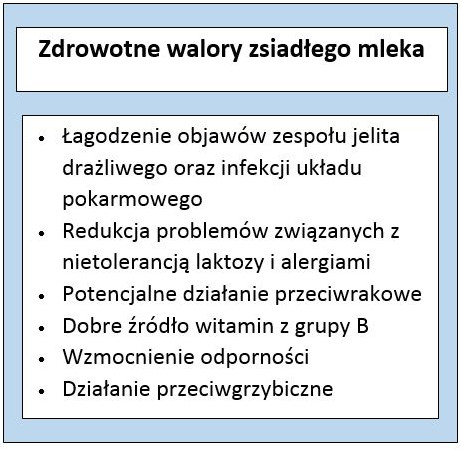 Nie zapominajmy też, że zsiadłe mleko jest dobrym źródłem białka zwierzęcego oraz ważnego dla kości i zębów wapnia oraz fosfor i potas.