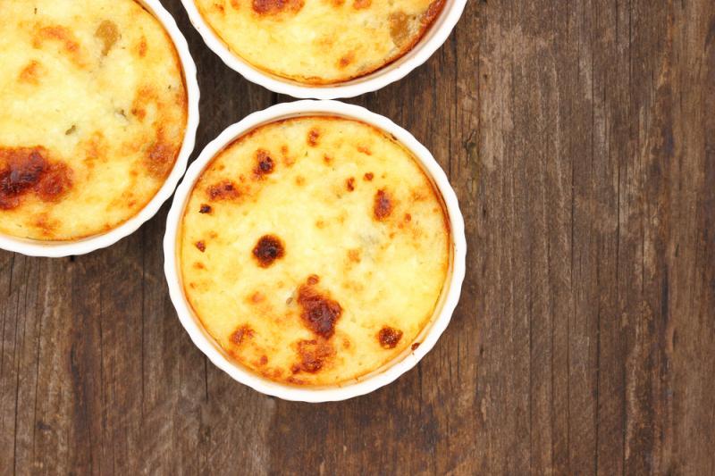 W misce ucieramy masło z cukrem na białą pianę. Dodajemy kilka kropli esencji, jajka i szczyptę soli i energicznie ubijamy. Następnie, naprzemiennie dodajemy zsiadłe mleko i mąkę, cały czas mieszając. Masę wylewamy do żaroodpornego naczynia i pieczemy 45 minut w temperaturze 180 stopni C. Podajemy na ciepło, polany syropem lub konfiturą.