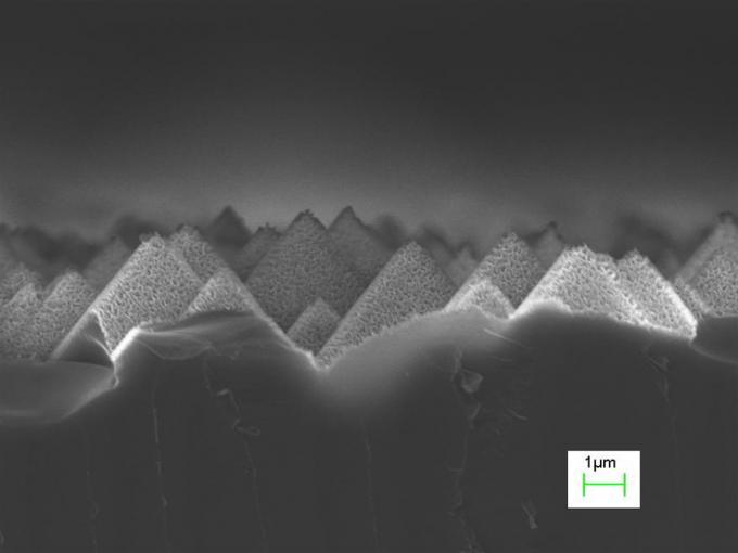 Nierówna struktura powierzchni chroni przed osadzaniem się wody i kurzu. Woda spada na panele zbiera się i szybciej spływa po powierzchni, zabierając ze sobą kurz i brud. Ten mechanizm oczyszczania pozwoli fotokomórkom absorbować maksymalną ilość energii. Poza tym trójwymiarowa powierzchnia pozwala przyjąć więcej światła (w mniejszym stopniu jest ono odbijane). Charakterystyka powierzchni została uzyskana za pomocą wodorotlenku potasu.