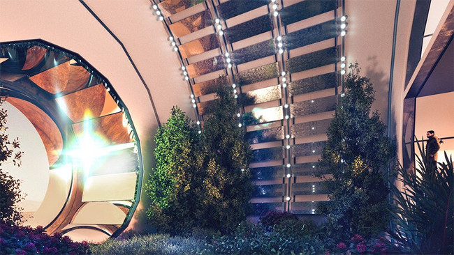 Wszystkie moduły zawierają tereny zielone i miejskie ogrody ze zwierzętami i zbiornikami wodnymi zaprojektowanymi w celu zapewnienia dobrego samopoczucia oraz przestrzeni dla sztuki. Aby stworzyć emocjonalne połączenie z ziemią, zespół projektantów włączył rozległe, sztucznie stworzone dwie naturalne przestrzenie zwane „zielonymi kopułami” – jedną, która pozwala na obecność człowieka i działa jak park, a drugą, która obejmuje eksperymentalną roślinność w środowisku wyłącznie marsjańskim.