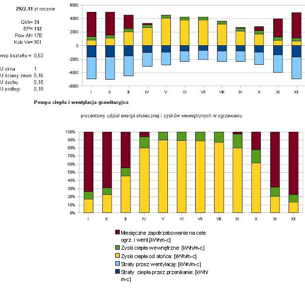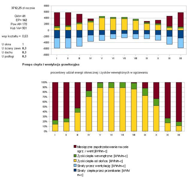W tym samym projekcie jeśli zastosujemy wentylację grawitacyjną i pompę ciepła. Koszt ogrzewania i ciepłej wody wyniesie 2920zł/rok.