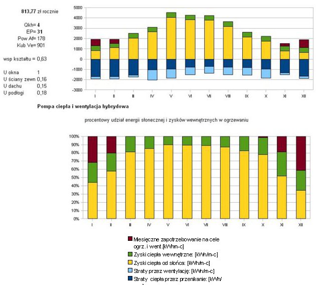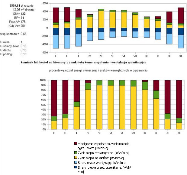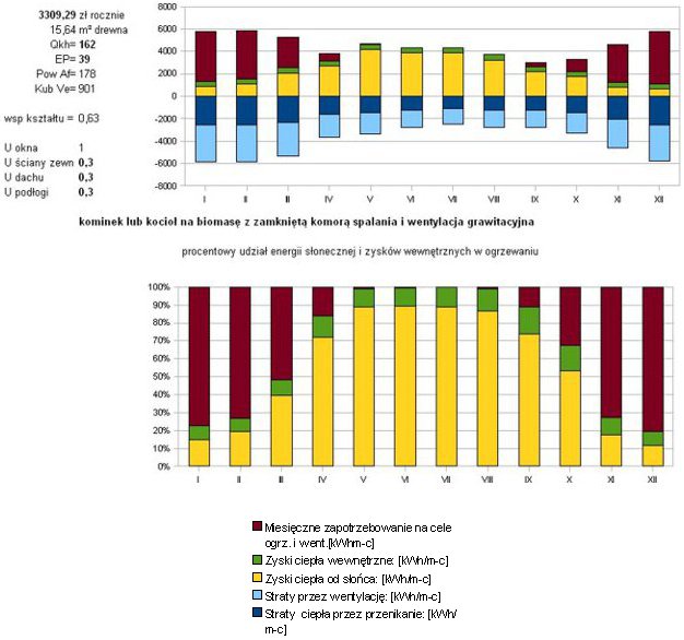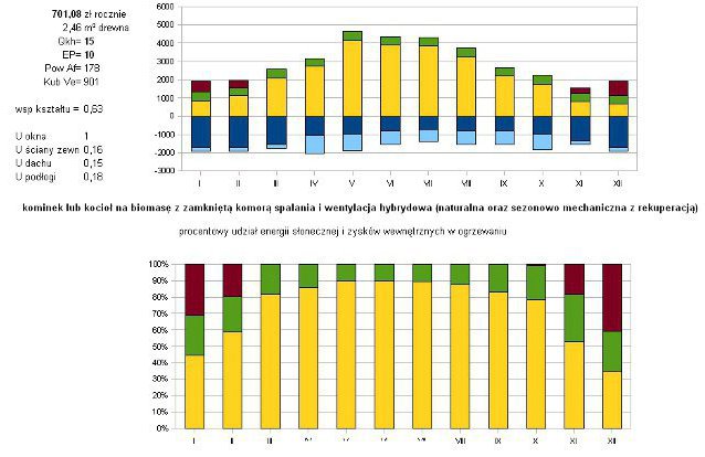 Jako dopełnienie całej analizy przedstawiam symulację dla domu modelowego, ale bez rekuperacji, czyli tradycyjny dom, ogrzewany drewnem, tylko lepiej izolowany. Jak widać sama izolacja domu nic znacząco nie zmienia. Dopiero kompleksowy projekt obejmujący izolacyjność, szczelność, helioaktywność i rekuperację, daje najlepszy efekt, taki jak na pierwszej ilustracji. Konkluzja jest taka, że jeśli dom jest mocno zaizolowany, nie opłaca się wentylować go grawitacyjnie przez cały rok. Poza tym rekuperacja praktycznie zastępuje system rozprowadzenie ciepła w budynku, podczas gdy kominek zastępuje tradycyjny kocioł grzewczy. Więc w podobnej, a może mniejszej cenie, uzyskujemy dużo bardziej sprawny układ. Jego cena również zależy od optymalnego projektu. Wykwalifikowany architekt wie, jak zaprojektować dom, aby instalacje były sprawniejsze oraz mniej awaryjne.
